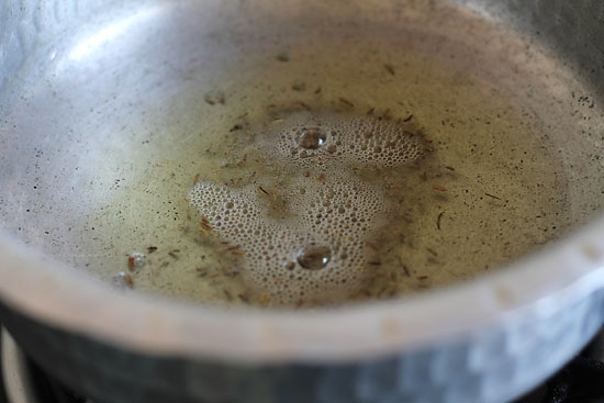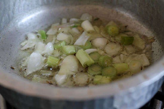 6. Once they give the crackling noise add chopped onion. Saute until they change color.